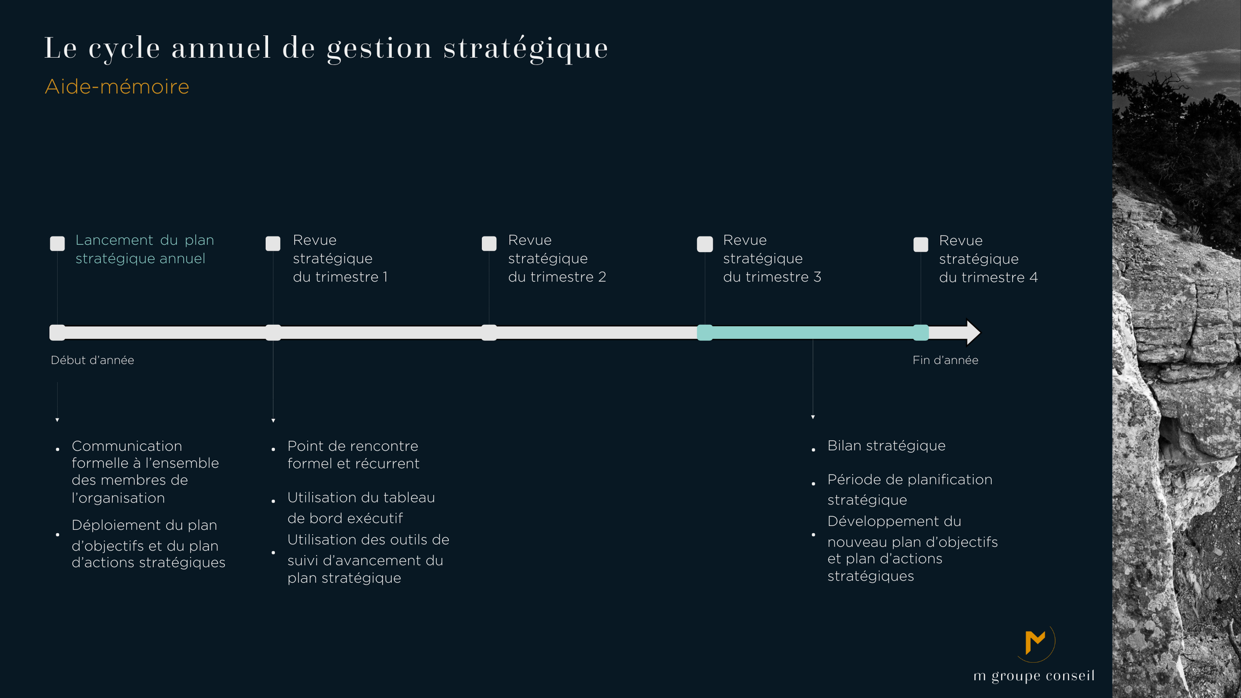 Quelques semaines avant la fin d'année, un bilan stratégique annuel est réalisé, puis l'élaboration de la planification stratégique s'amorce pour l'année à venir.